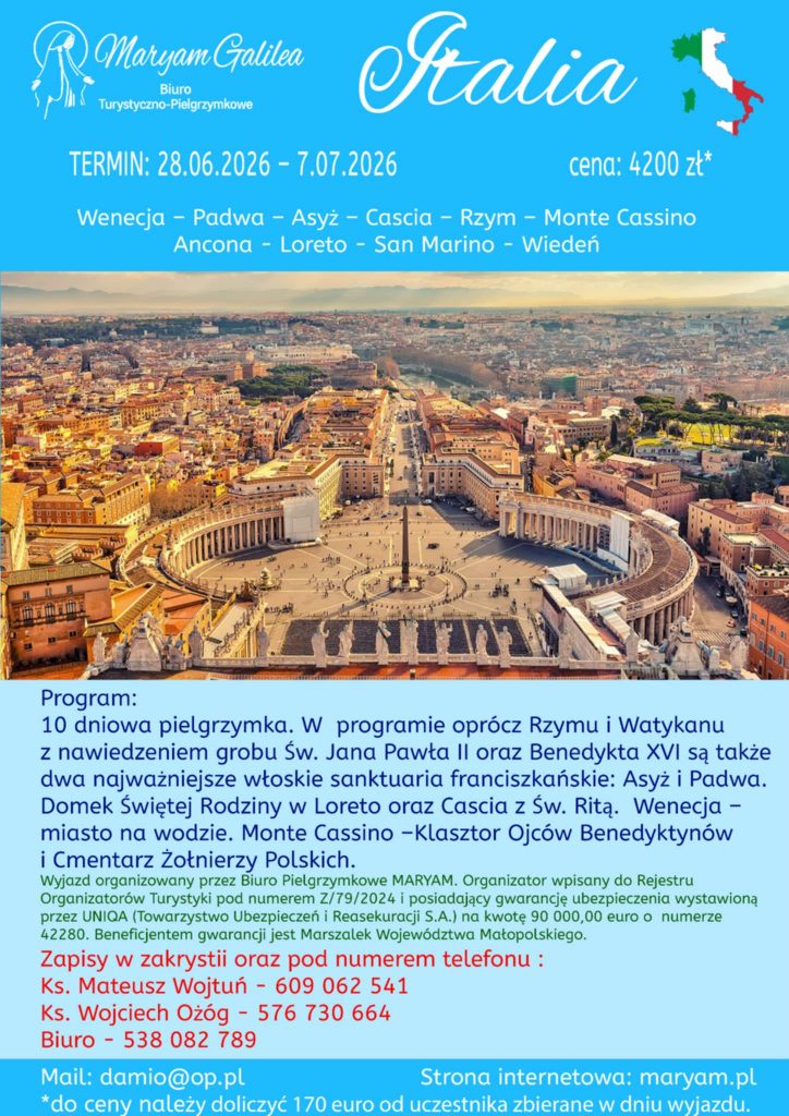 10 dniowa pielgrzymka. W programie oprócz Rzymu i Watykanu z nawiedzeniem grobu Św. Jana Pawła II oraz Benedykta XVI są także dwa najważniejsze włoskie sanktuaria franciszkańskie: Asyż i Padwa. Domek Świętej Rodziny w Loreto oraz Cascia z Św. Ritą.